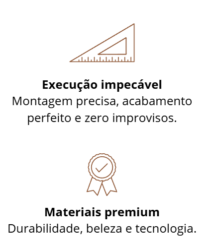 Trabalhamos apenas com materiais de alto padrão: MDF premium, ferragens de primeira linha, acabamentos modernos e resistentes. Você escolhe entre diversas opções de cores, texturas e pedras para bancadas.